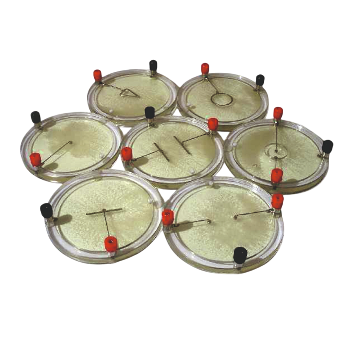 Набор предназначен для демонстрации конфигурации силовых линий, которые создаются проводниками разной формы. Набор состоит из 7 закрытых прозрачных кювет, в которых находится по одному или несколько электродов. Данный комплект может использоваться в следующих разделах электростатики: